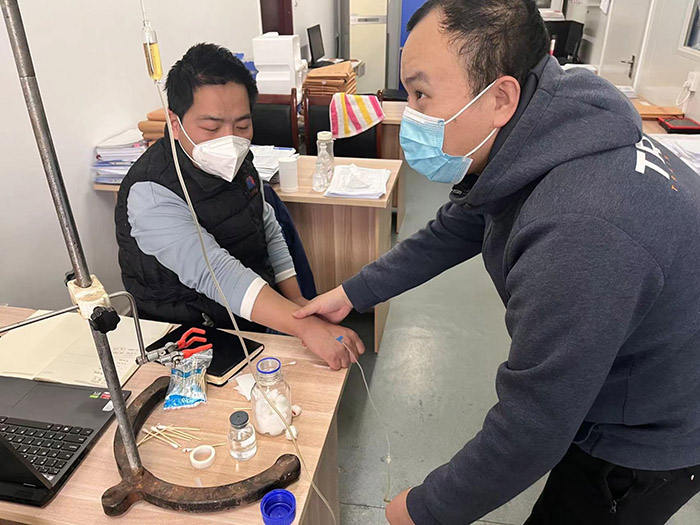 “哪位同事會(huì)輸液?”一聲令下孫江挺身而出來到三廠給王潤(rùn)偉輸液扎針。由于第二天孫江工作需要脫不開身,眼看好轉(zhuǎn)的王潤(rùn)偉沒有人給輸液了,這可怎么辦?我跟王潤(rùn)偉說我扎過兔子,我敢下手,但是不一定能扎進(jìn)去,你敢嗎?他笑笑說:“你在我這練練就會(huì)了。”我拿起輸液器嘗試了兩次仍沒有扎進(jìn)去,緊張的我出了一身汗,抬頭看看王潤(rùn)偉我十分抱歉的說:“真不好意思,兩針都沒進(jìn)去。”他毫不在意的笑著說:“沒事多扎幾針就行了。”但是在強(qiáng)大的心理壓力下,我不敢再次嘗試。張總又一次緊急尋找能輸液扎針的人,最后找到了只扎過兩次針的道恩化驗(yàn)室微生物組組長(zhǎng)呂文杰。呂文杰看看王潤(rùn)偉的手說:“你這確實(shí)不好扎。”兩針下去又沒有成功。扎過針的人都知道越是扎不中血管疼痛就會(huì)越劇烈,王潤(rùn)偉沒有任何責(zé)備,一直保持著微笑,說到:“咱們換只手扎吧。”又一針下去終于成功了。呂文杰如釋重負(fù),擦了擦頭上的汗對(duì)王潤(rùn)偉豎起了大拇指。