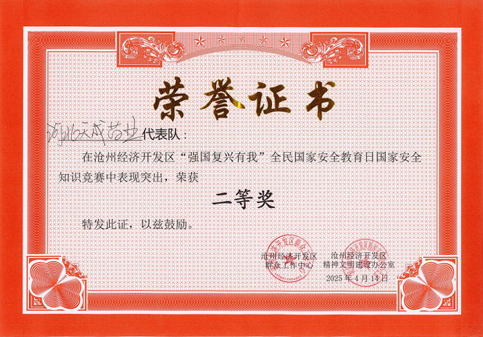 滄州經(jīng)濟開發(fā)區(qū)舉辦“強國復興有我”國家安全知識競賽活動 天成藥業(yè)代表隊榮獲二等獎