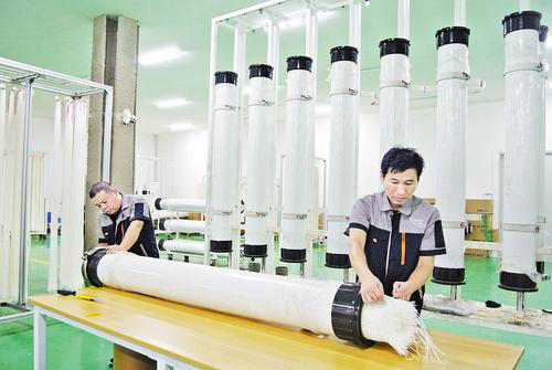8月20日,海派特膜科技(河北)有限公司工人在生產(chǎn)車間組裝柱式膜組件。 本組圖片由本報(bào)記者王雅楠攝