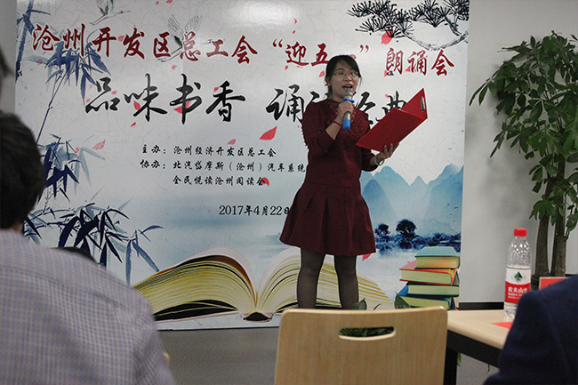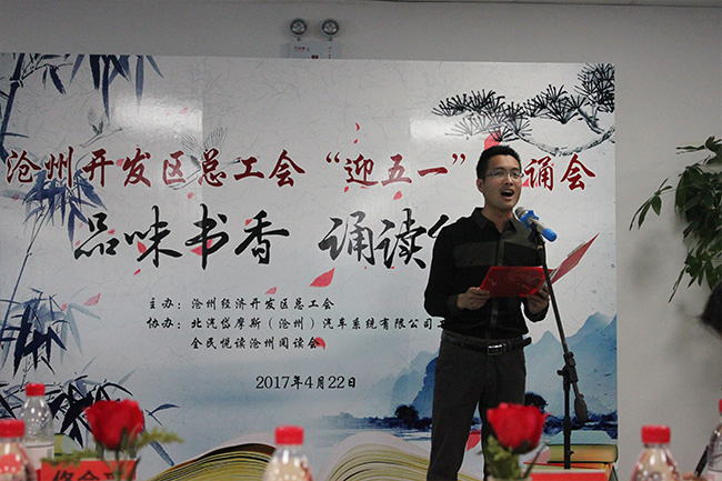 2017年4月22日,滄州開(kāi)發(fā)區(qū)總工會(huì)主辦,北汽岱摩斯(滄州)汽車系統(tǒng)有限公司工會(huì)、全民悅讀滄州閱讀會(huì)協(xié)辦的“迎五一誦讀會(huì)”如期舉行。此次朗讀會(huì)主題為“品味書香,誦讀經(jīng)典”,是為打造滄州東部新城,在開(kāi)發(fā)區(qū)推廣全民閱讀的一次嘗試。我公司職工劉艷麗、鄭福貴分別在會(huì)上深情朗讀了詩(shī)歌《相信未來(lái)》、《希望,展翅飛翔》。