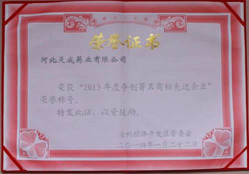 2014年榮獲“2013年度爭創(chuàng)著名商標(biāo)先進(jìn)企業(yè)”榮譽稱號